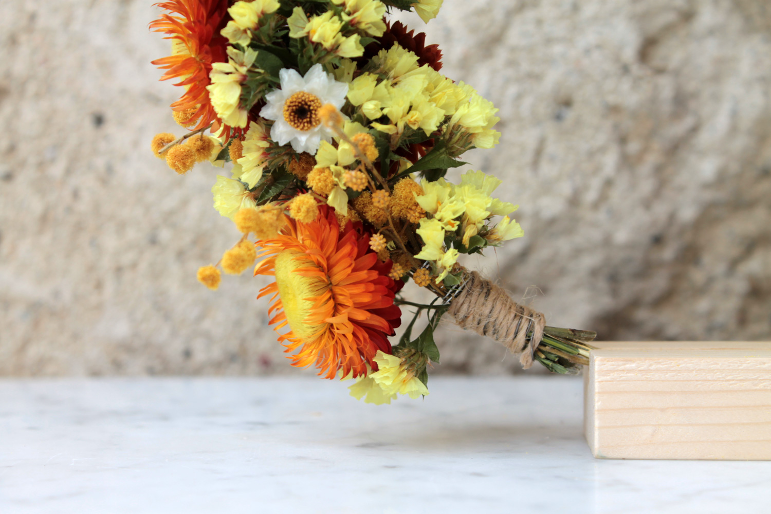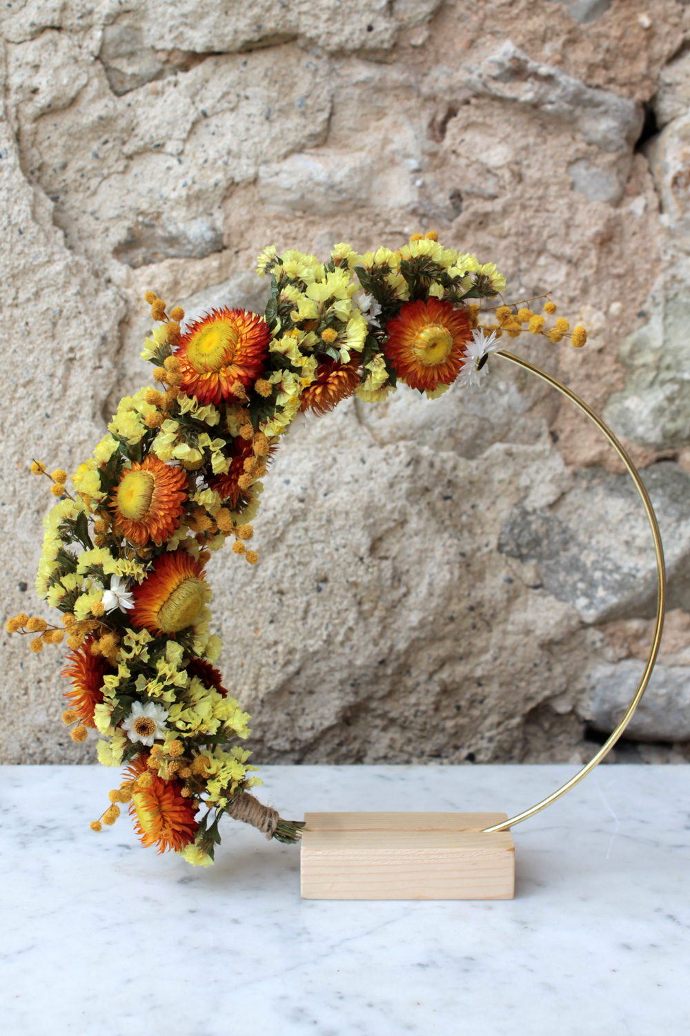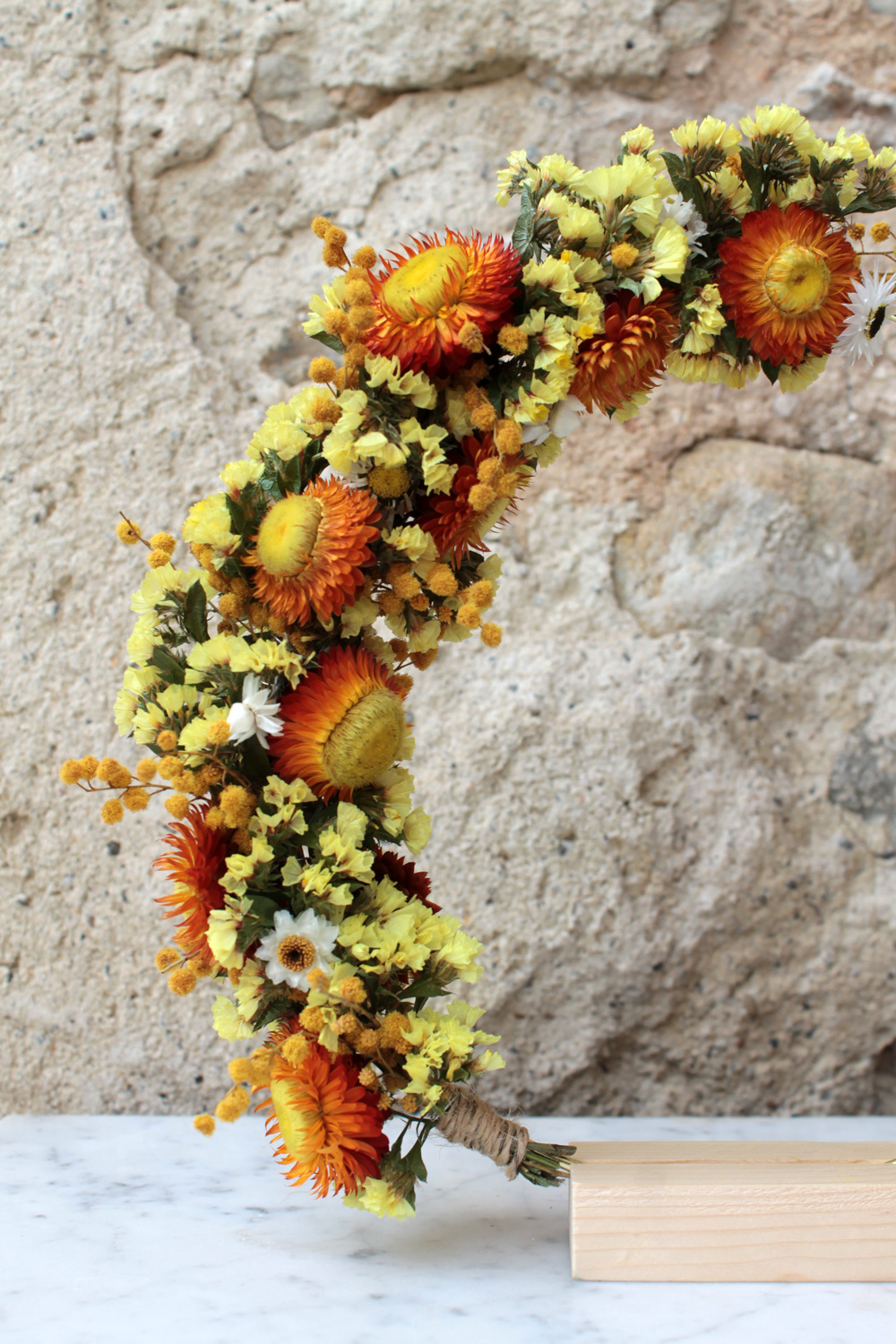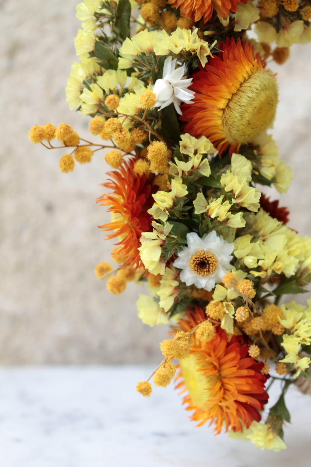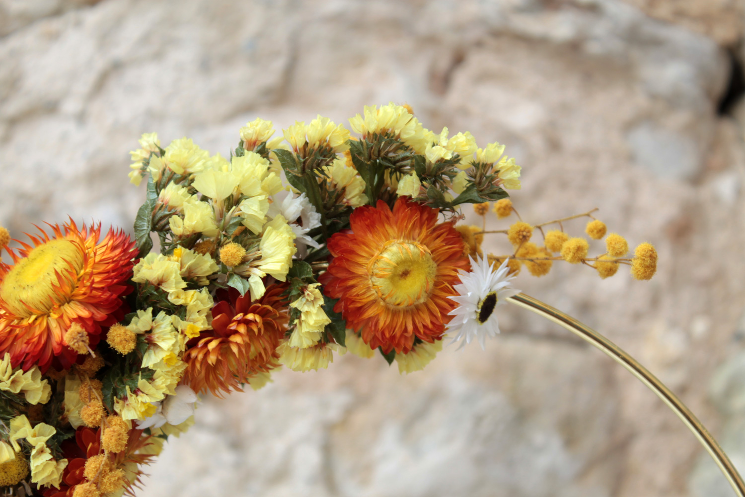 Chaque couronne est réalisée à partir de fleurs cueillies dans le respect de la nature puis immortalisée par séchage naturel. Chaque plante étant différente, toutes les couronnes sont uniques.